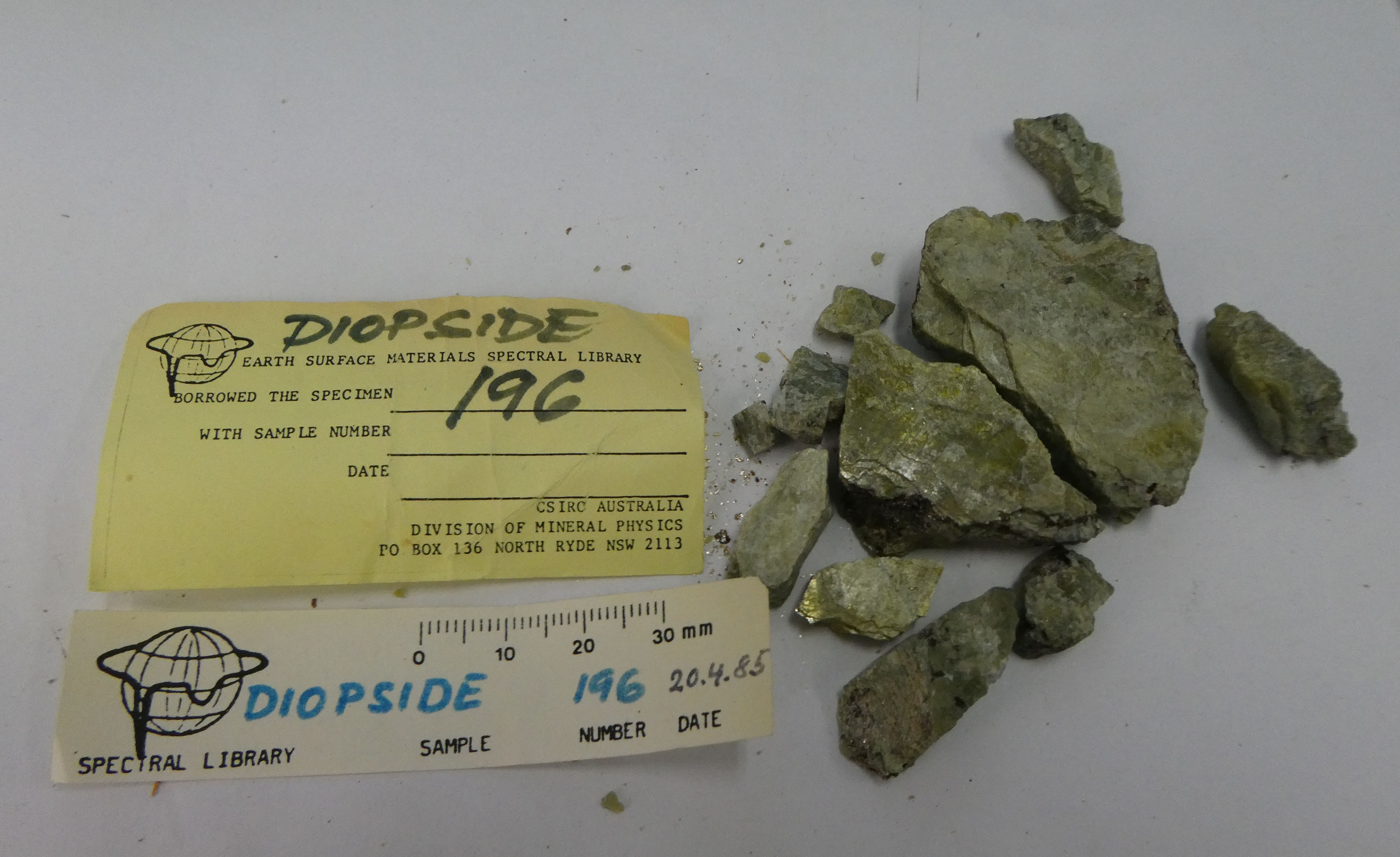 Image of Labradorite, Augite, Diopside (var. Fe2+), Lizardite, Nontronite-15.6A, Quartz, Rhodonite and Tremolite in specimen 'MT8397 Labradorite / Diopside' [CSIRO].