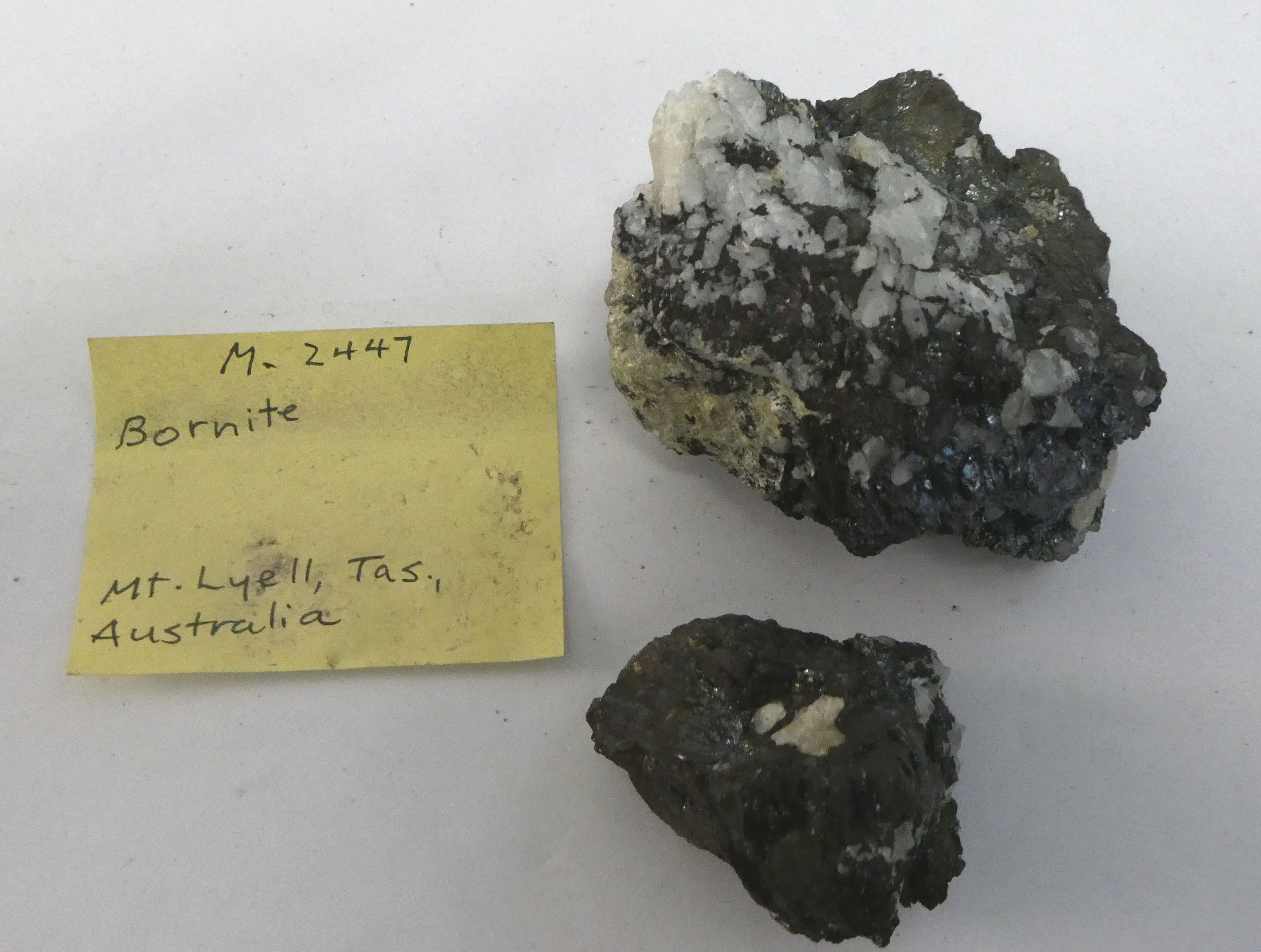 Image of Bornite, Calcite, Hydroxylapatite and Quartz in specimen 'M2447 Bornite' [CSIRO], from Mount Lyell, West Coast Region, Tasmania, Australia.