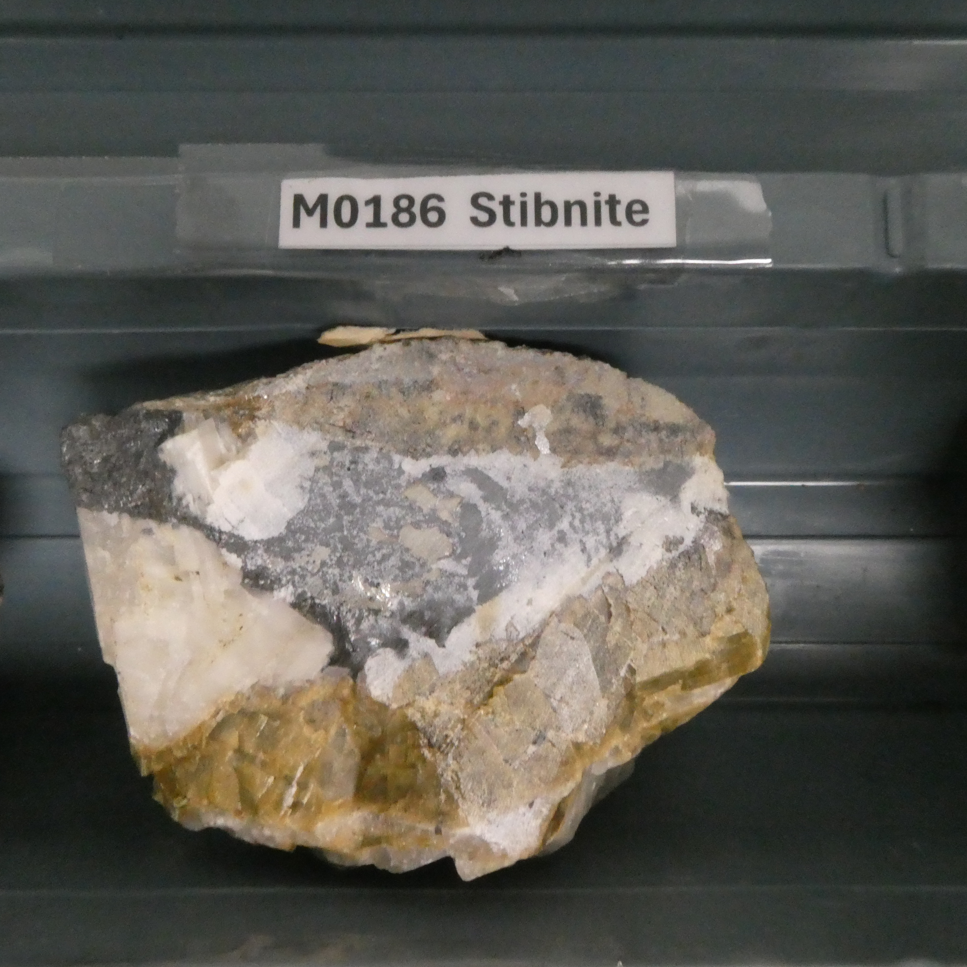 Image of Calcite (var. Mg), Litharge, Muscovite-1M, Muscovite-2M1, Quartz, Siderite, Siderite (var. Mg, Ca), Stibnite and Wüstite in specimen 'M0186 Stibnite / Calcite / Siderite ' [CSIRO].