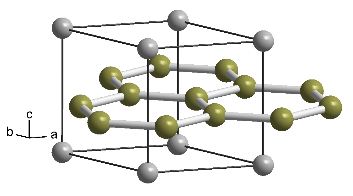 Crystal structure of TiB2. Created using Diamond 4. Data from Moehr, S; Mueller-Buschbaum, Hk; Grin, Y; Schnering, H G von H-Ti O oder Ti B2? - eine Korrektur Zeitschrift fuer Anorganische und Allgemeine Chemie, 622, 1035-1037 (1996)
